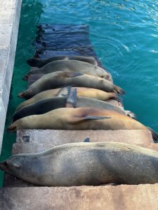 Galapagos sea lions line the dock steps. Photo by Vicki Clark.