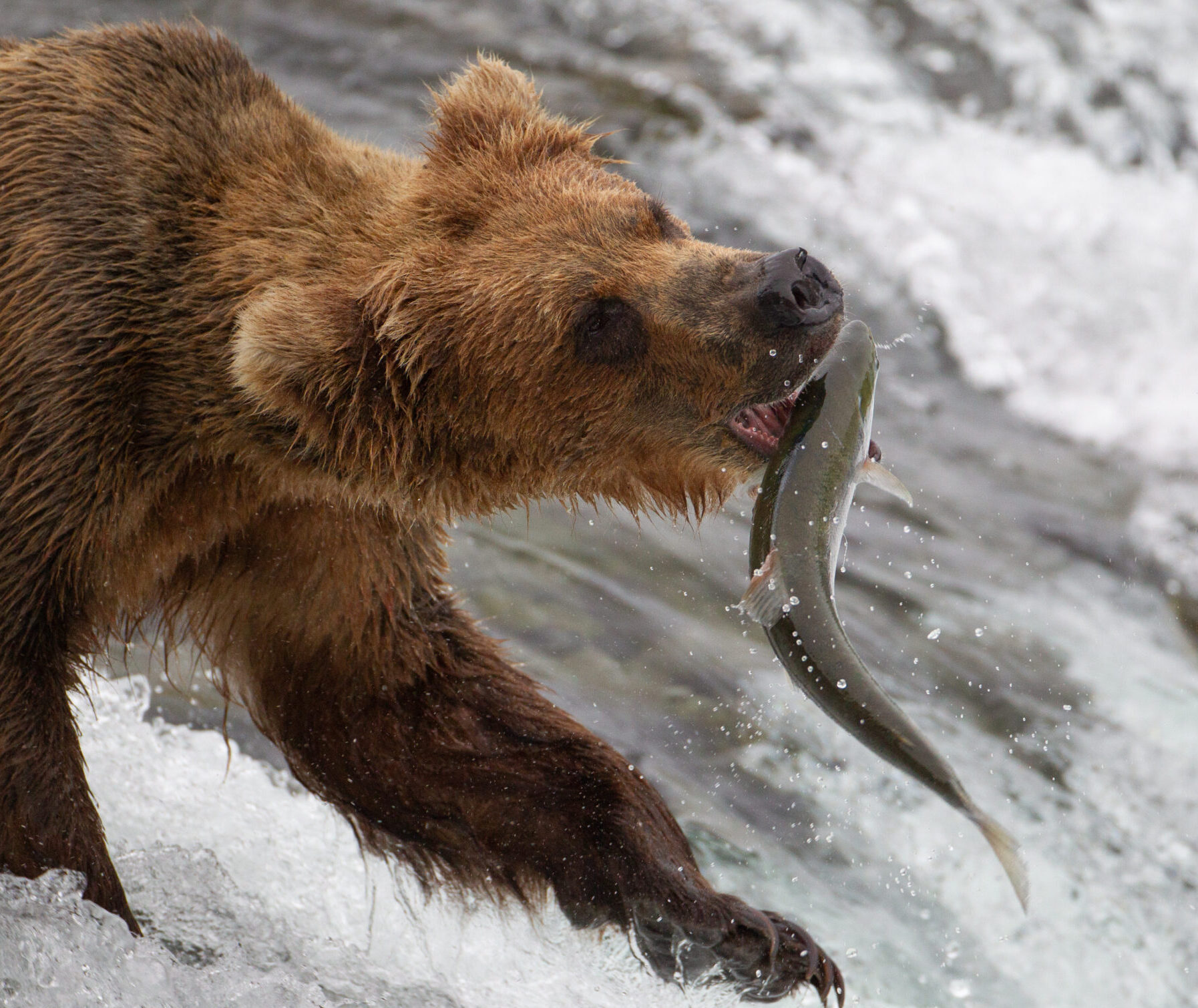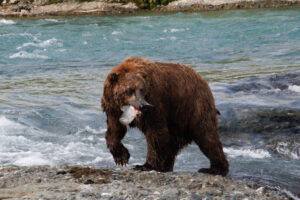 A brown bear with its catch at McNeil Falls. Photo by Madison Grosvenor