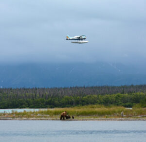 A float plane flies above a sow and her two cubs in Katmai National Park. Photo by Paxson Woelber.