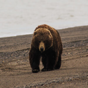 A brown bear ambles down the beach near Lake Clark National Park and Preserve. Photo by Madison Grosvenor.