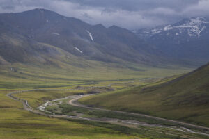 The Dalton corridor and Koyukuk river winding through the Brooks Range near Coldfoot and near the start of the proposed Ambler road. Photo by Bob Wick.