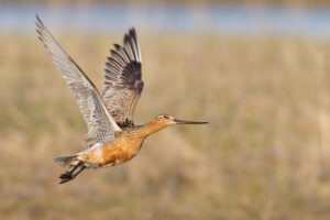A bar-tailed godwit in flight. Photo by Milo Burcham.