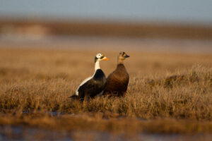 A pair of spectacled eiders rests at the edge of a tundra pond within the Arctic Refuge. Peter Pearsall.