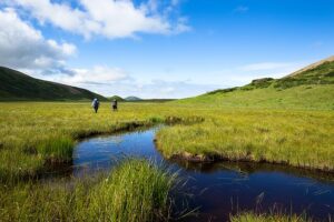 Two people hike with packs in a green landscape where a stream and wetland area wind through a valley. Credit: Lisa Hupp/USFWS.