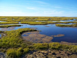 Freshwater marshlands, though less extensive than peatlands, are an important part of Alaska’s wetland landscape. These wetlands are characterized by open, shallow water areas dominated by grasses, reeds, sedges, and other herbaceous plants. Unlike peatlands, marshes typically have mineral-rich soils and more dynamic water levels, often influenced by seasonal flooding or river flow. They provide critical habitat for a wide variety of waterfowl, shorebirds, and fish, serving as breeding, nesting, and feeding grounds.