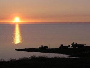 Researchers’ boats beached on the shore of Teshekpuk Lake, National Petroleum Reserve. Photo by Tim Craig.